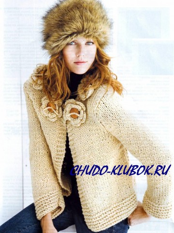 Вам потребуется: пряжа Lanas ASTUN (55% акрила, 45% шерсти, 100 г/90 м), цв. 749(бежевый): 6/6/7 мотков. Спицы №7. 4 пуговицы диаметром 4 см светло-коричневого цвета.