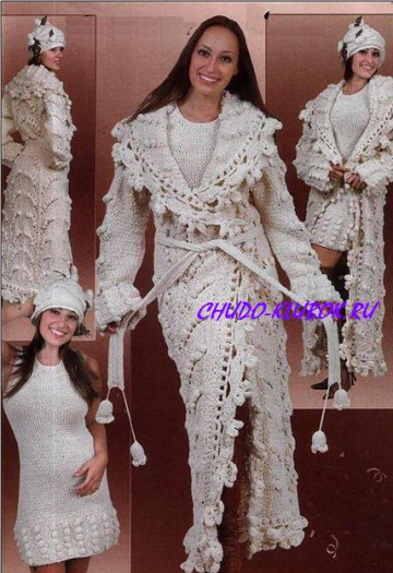 Вам потребуется: 500 г пряжи Тепло и уютно (100% шерсти. 400 м/100 г). 900 г пряжи «модное звучание» (98% шерсти. 2% полиамида. 200 м/100 г). 800 г пряжи «Конкурентная» (50% шерсти. 50% акрила 250 м/100 г) — вся пряжа белого цвето; спицы N» 5, крючок№ 4