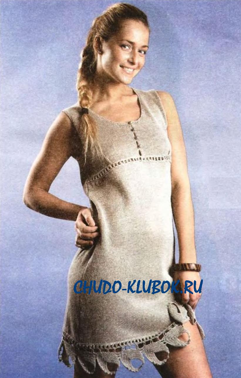 Вам потребуется: пряжа (50% лен, 50% вискоза, 360 м/ 100 г) — 400 г серого цвета, спицы №2, крючок №3, 4 пуговицы-бусины.